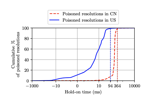 例如 Paper 裡面提到在他們中國的機器上,收到第一個 DNS 回覆後(因為這邊是 delta time),只要再等上 364ms,就可以 99% 確保收到第二個真實的回覆。