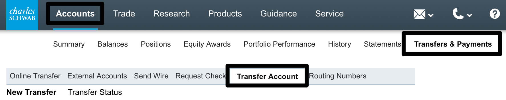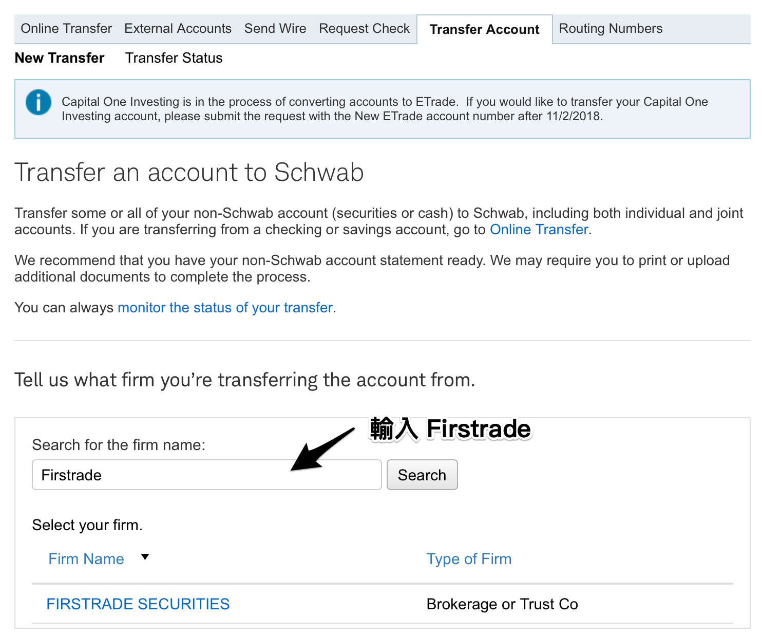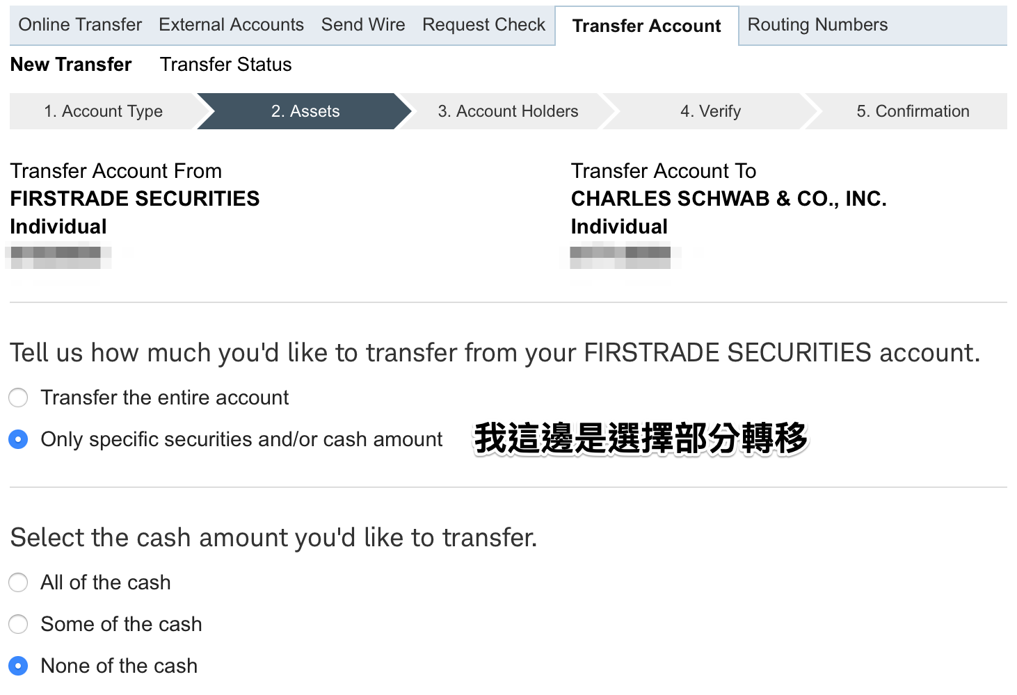 1. 透過嘉信網站點選 Transfer Account 觸發轉賬。