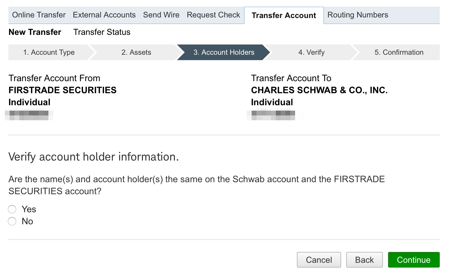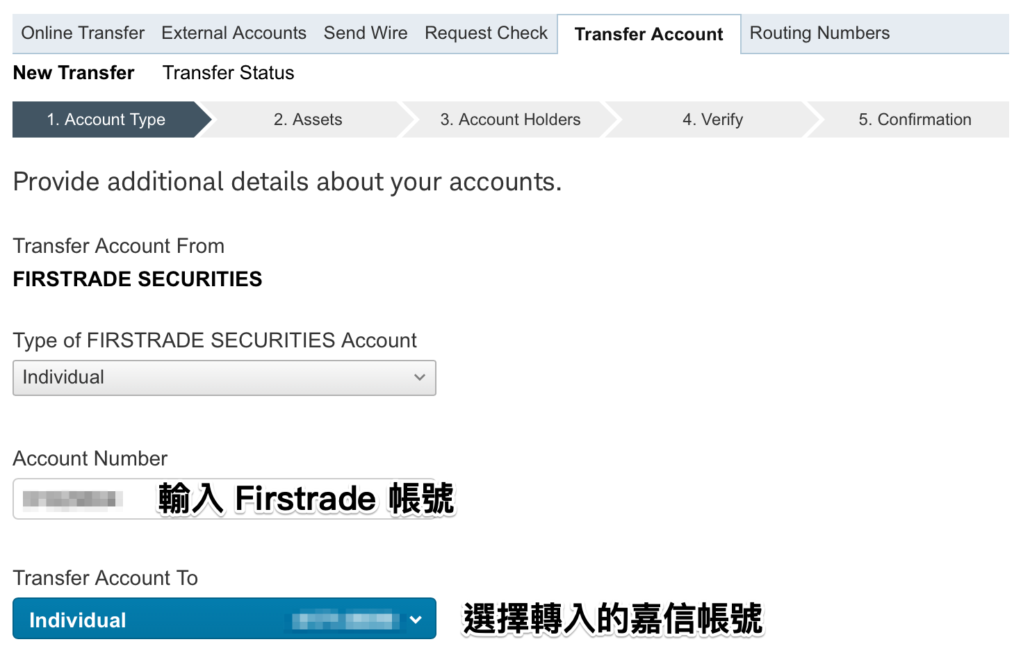3. 輸入 Firstrade 帳號以及選擇轉入的嘉信帳號。