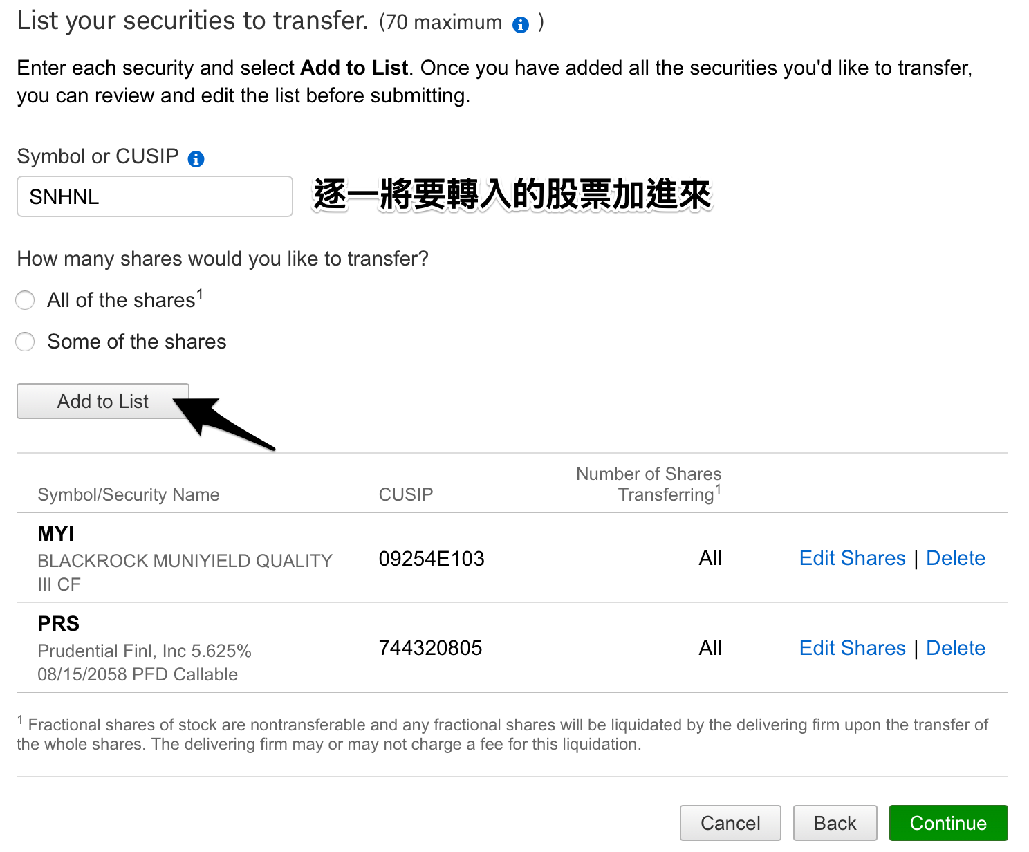 5. 逐一將要轉入的股票加進來,可以選擇轉入所有或部分股數。