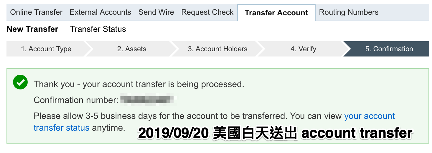 此篇文章分別說明 2019 下半年使用嘉信申請 ACAT 轉帳的流程,約 3-4 個工作天可完成轉移。