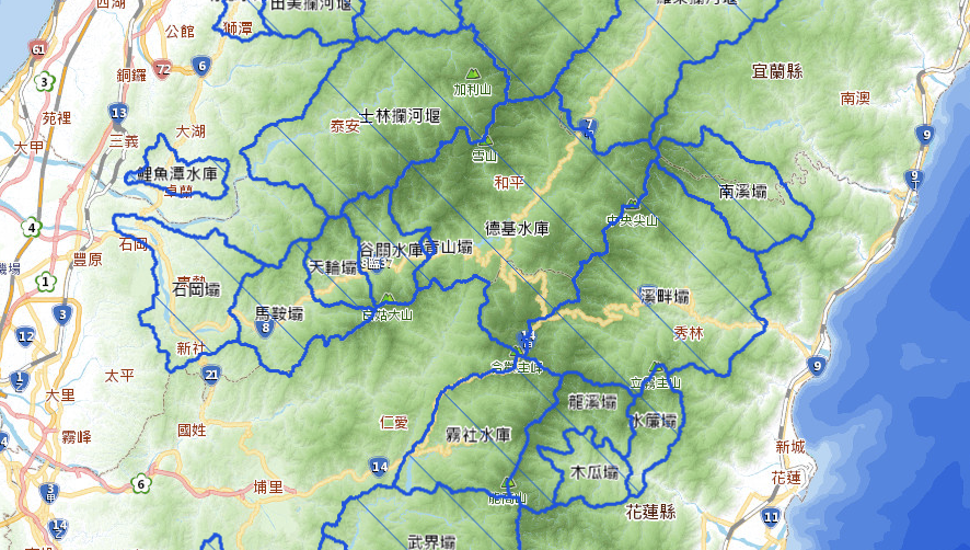 - 水庫集水區查詢 https://tppr.wra.gov.tw/sencad/,